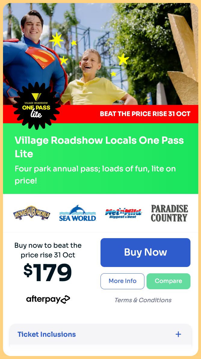 The Locals One Pass and Locals One Pass Lite, offering entry to Movie World, Sea World, and Wet’n’Wild, are set to see a price rise soon - though the new pricing has yet to be disclosed. The "Locals One Pass" currently costs $219 (or $189 to renew), while the "Locals One Pass Lite" is priced at $179 for new purchases and $169 for renewals.
