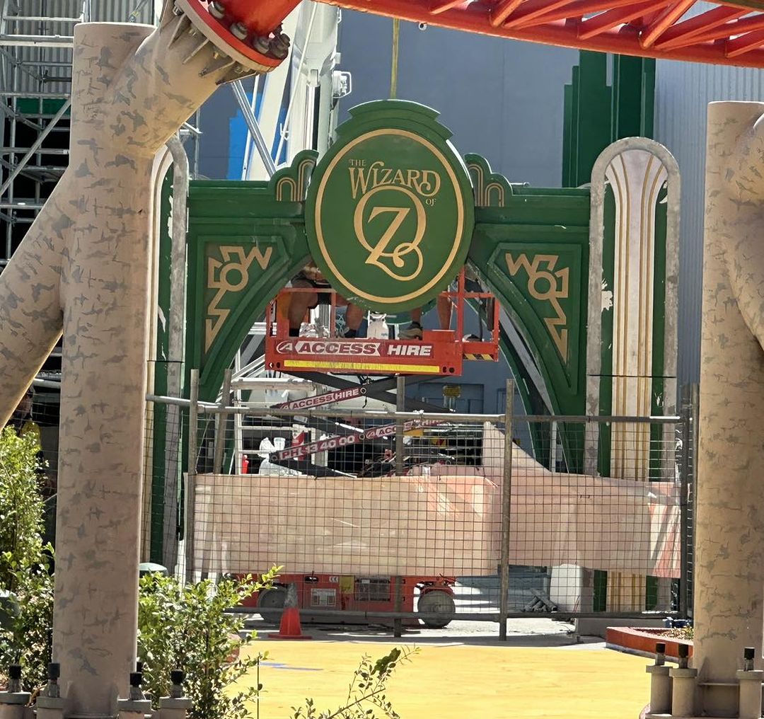 Recent developments in Warner Bros. Movie World’s highly anticipated Wizard of Oz precinct have seen key thematic elements coming together, marking significant progress toward the land’s completion. Captured by Theme Park Ogre, the latest photos show the installation of the distinctive “Wizard of Oz” sign on an ornate archway that will welcome guests into this vibrant new area. Additionally, the famous Yellow Brick Road is now visible, winding its way into the precinct.
